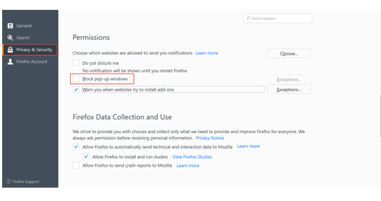 - Under "Permissions", disable the Firefox pop-up blocker by un-checking the "Block pop-up windows" option. Optionally, leave the pop-up blocker on and allow pop-ups from "onlinexperiences.com". To allow pop-ups for a site, click the "Exceptions" button and enter "onlinexperiences.com". Click the "Allow" button. Note: Sites not hosted on onlinexperiences.com may be used as a pop-up window within the event. Those sites need to be inserted on an as-needed basis. For this reason, it is best practice to completely disable all pop-up blockers for the duration of the event.