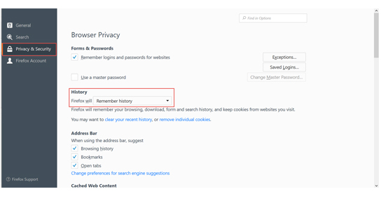 - Under "History" and "Firefox will:", the drop down menu should read "Remember History".
