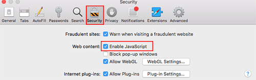 Overview: Confirm that the user's Safari Security options are configured correctly. This setting is accessed from the "Safari --> Preferences" menu in Safari.