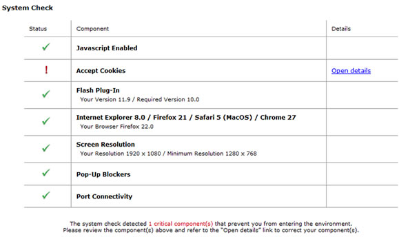 Overview: This simple test attempts to store a cookie and then read it back. Failures here indicate a change is necessary in the user's cookie settings, or they have third-party software that is blocking cookies.