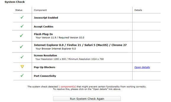 NOTE: If a Pop-up blocker is enabled in Chrome, it will not be detected on the system check. The user will be notified by the Chrome browser that a Pop-up was blocked. Chrome does not block the function of a Pop-up window, only its display to the user.